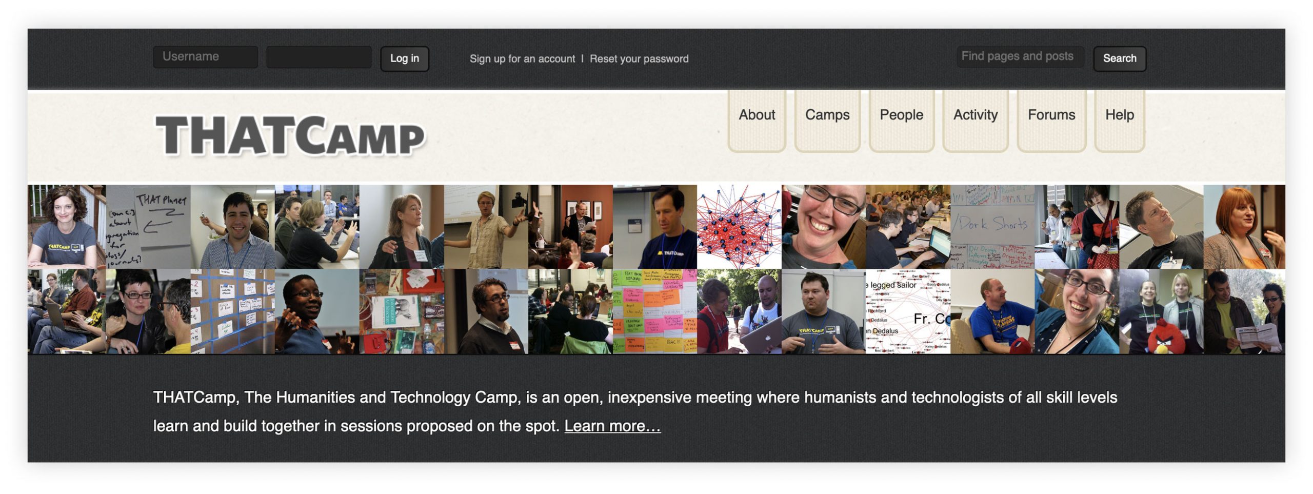 Short for “The Humanities and Technology Camp,” THATCamp is a user-generated “unconference” on digital humanities—an open, inexpensive meeting where humanists and technologists of all skill levels learn and build together in sessions proposed on the spot. Since the first THATCamp was held in 2008, there have been more than a hundred THATCamps around the world.